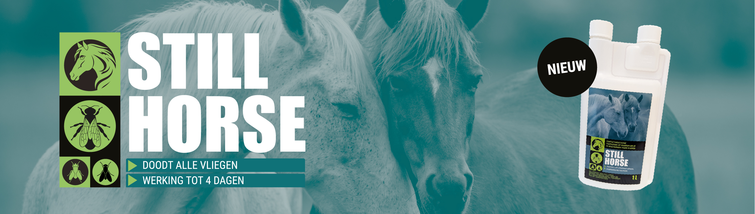 Still Horse is een contactinsecticide voor toepassing op paarden, om ze te beschermen tegen vliegen. Vliegdodend en tot 4 dagen werking.